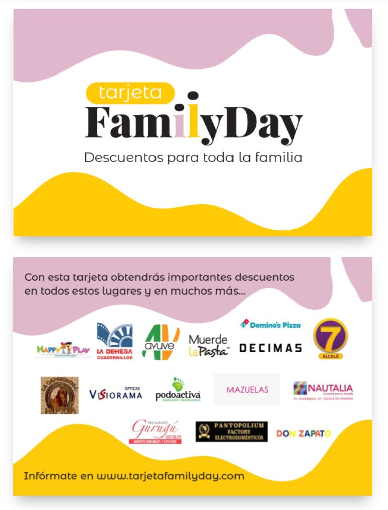 Aprovecha las oportunidades de un gran proyecto social exclusivo, serio, con compromiso y las ventajas que te ofrece el poseedor de la tarjeta FamilyDay dirigida a escuelas, empresas, familias, colegios, particulares,etc…, en el que tendrás una gran visibilidad de tu empresa y creando sinergias entre ellas.